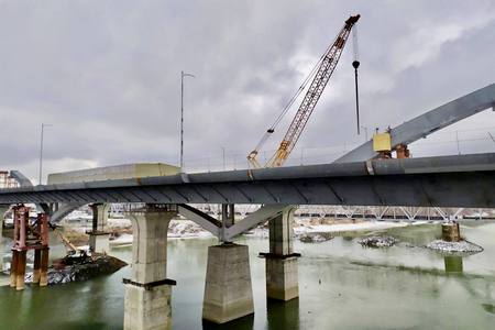 Монтаж и сварка металлоконструкций пролетного строения выполнены на 98%. Обустроена ливневая канализация и смонтирован на мостовом переходе водоотводный коллектор.