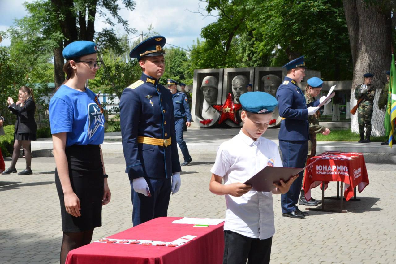 В парке воинской доблести Крымска прошла церемония вступления в ряды военно-патриотического общественного движения «Юнармия» 150 школьников – им после прочтения присяги вручили нагрудные значки и удостоверения. «Юнармейцы не только изучают героические страницы нашего прошлого, чтят память героев, но и сами проходят основы начальной военной подготовки, спортивные соревнования, которые формируют из них настоящих граждан великой Родины», — подчеркнул политик.