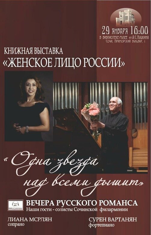 29 января в 16.00 библиотека им. А. С. Пушкина приглашает на лекцию-концерт в цикле «Вечера русского романса». Нас посетят солисты Сочинской филармонии Лиана Мсрлян и Сурен Вартанян. Будет исполнена вокальная и инструментальная музыка русских композиторов Сергея Рахманинова, Антона Аренского и Александра Скрябина. Гостям будет представлена книжная выставка «Женское лицо России». Ждём всех ценителей прекрасного!