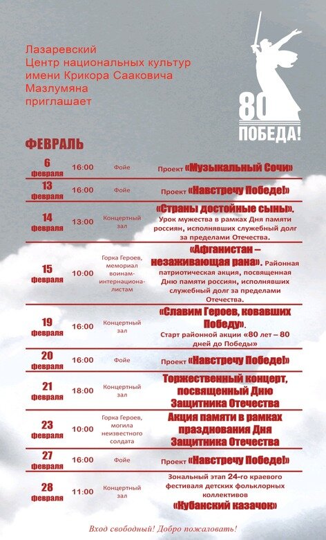 Лазаревский Центр национальных культур им. Крикора Сааковича Мазлумяна рад пригласить Вас на февральские мероприятия