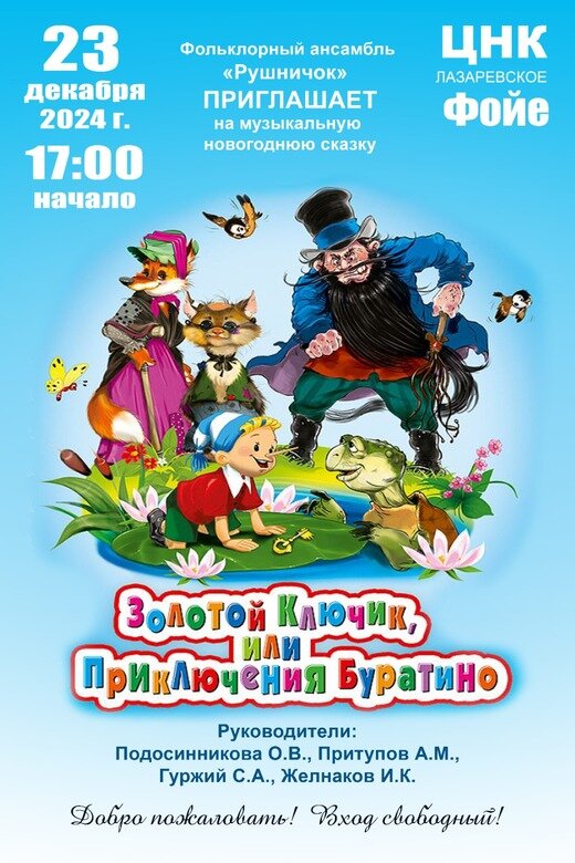 23 декабря начало в 17:00 фойе ЛРЦНК Юные актеры приглашают вас на музыкальную новогоднюю сказку «Золотой ключик,или приключения Буратино» Мальвина, Пьеро, Артемон,