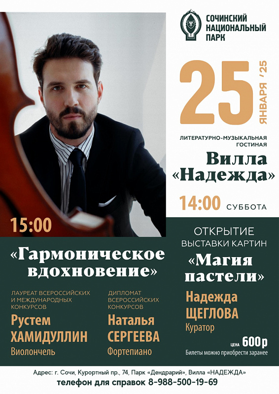 25 января в 15:00 в литературно-музыкальной гостиной Виллы "Надежда" в парке "Дендрарий" состоится творческое событие «Гармоническое вдохновение». В 14:00-открытие выставки картин «Магия пастели».