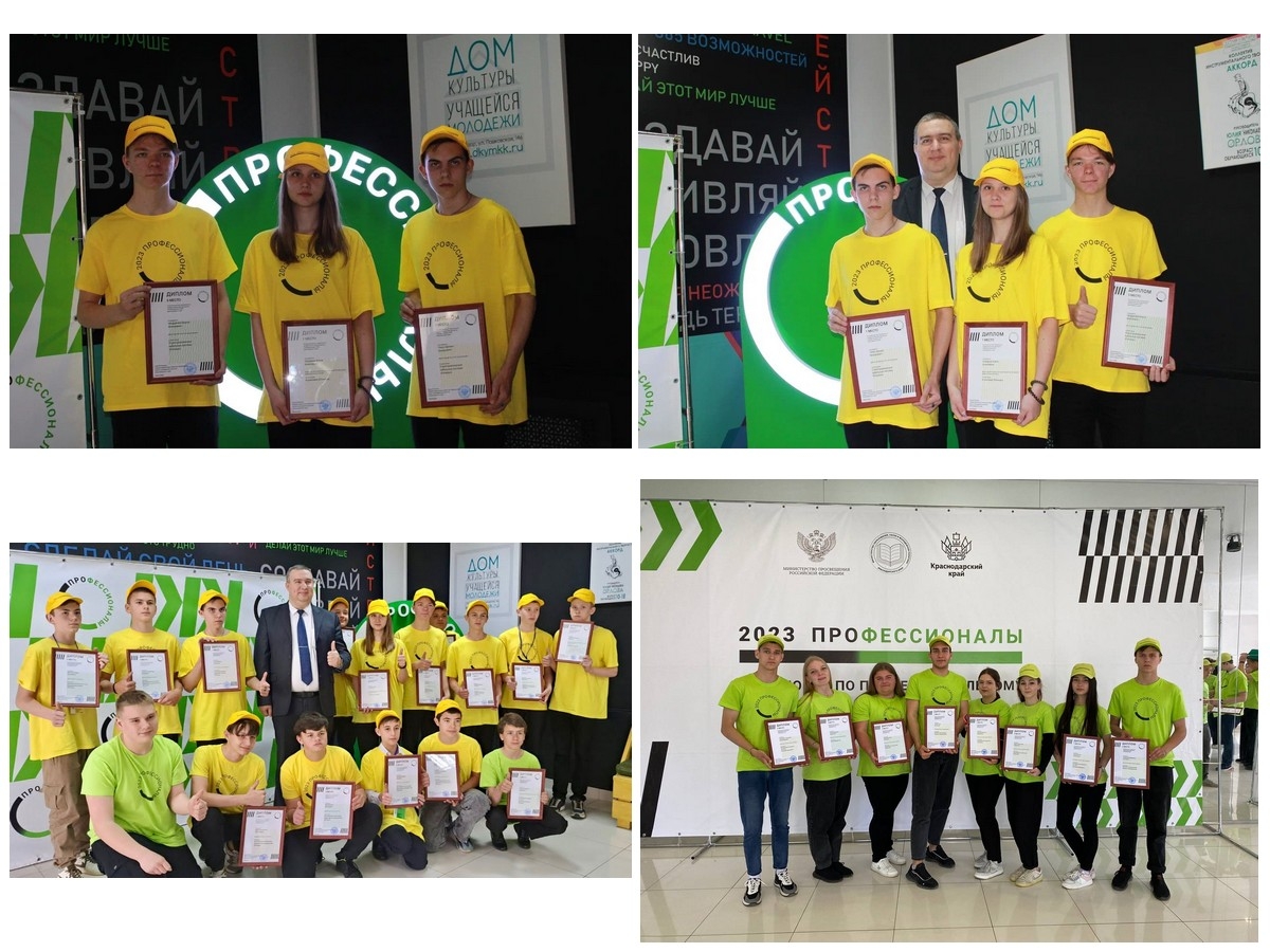в компетенции «Агрономия» 1 место занял Гордиенко Денис; в компетенции «Изготовление прототипов» 1 место у Марченко Ярослава и Краснова Даниила, 3 место заняли Гришин Артем и Лукашов Ростислав; в компетенции «Эксплуатация беспилотных авиационных систем» 1 место занял Бутенко Назар; в компетенции «Ветеринария» 3 место присуждено Бочарову Даниилу; в компетенции «Эксплуатация сельскохозяйственных машин» 1 место занял Вахаев Зелимхан; в компетенции «Ремонт и обслуживание легковых автомобилей» 3 место у Шевченко Артема; в компетенции «Кузовной ремонт» 2 место у Стойкова Александра; в компетенции «Управление бульдозером» 3 место занял Кириевский Виталий; в компетенции «Управление фронтальным погрузчиком» 3 место у Припутнева Богдана; в компетенции «Обслуживание тяжелой техники» 3 место - Киричанский Артём; в компетенции «Управление автогрейдером» медальон у Кисилёва Романа и Свиридова Ильи.Победители регионального этапа летом примут участие в отборочных соревнованиях, по результатам которых определят финалистов. Они представят Краснодарский край на Чемпионате по профессиональному мастерству «Профессионалы», который пройдет в Санкт-Петербурге с 25 по 29 ноября.