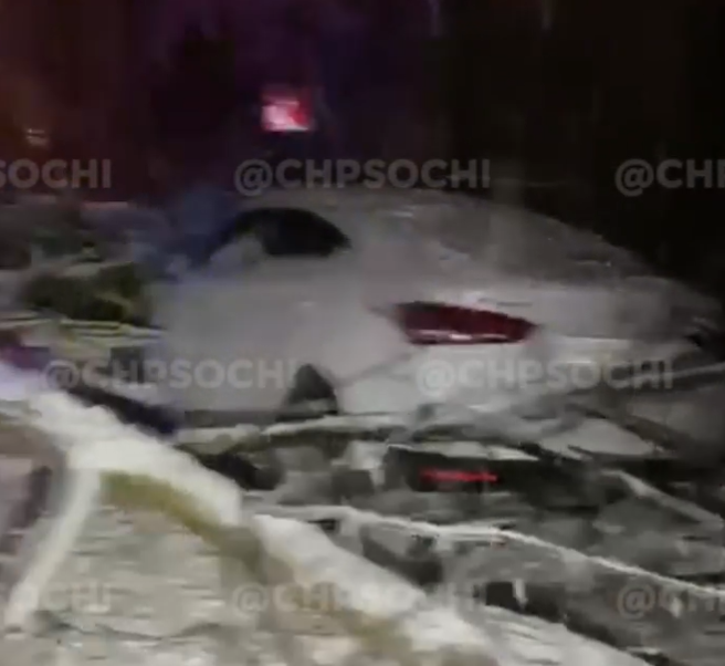 Последствия инцидента сняли на видео Фото: скриншот видео В Волконке, в селе Лазаревского района Сочи, вечером 14 февраля произошел неприятный инцидент — деревом и камнями повредило две машины.
