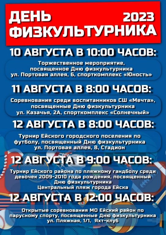 Приглашаем жителей, гостей города Ейска и Ейского район на мероприятия, посвященные Дню физкультурника!
