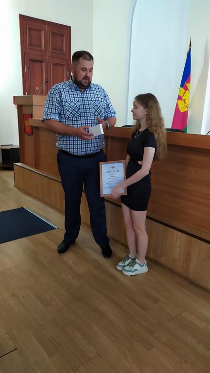 В торжественной обстановке под овации председателей, заместителей председателей и секретарей участковых комиссий, председатель ТИК Ейская городская Илья Меркаленко поздравил победительницу образовательной акции «Избирательный диктант» и пожелал удачи при поступлении в высшее учебное заведение.