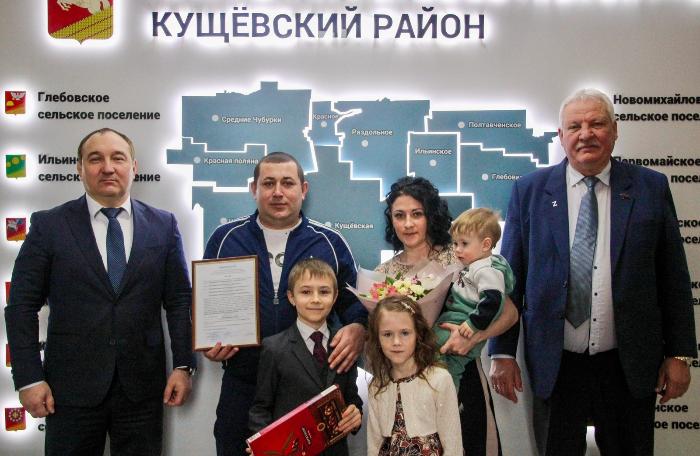 Глава Кущёвского района Илья Гузев с председателем районного Совета депутатов Александром Туренко вручили свидетельство о праве на получение социальной выплаты