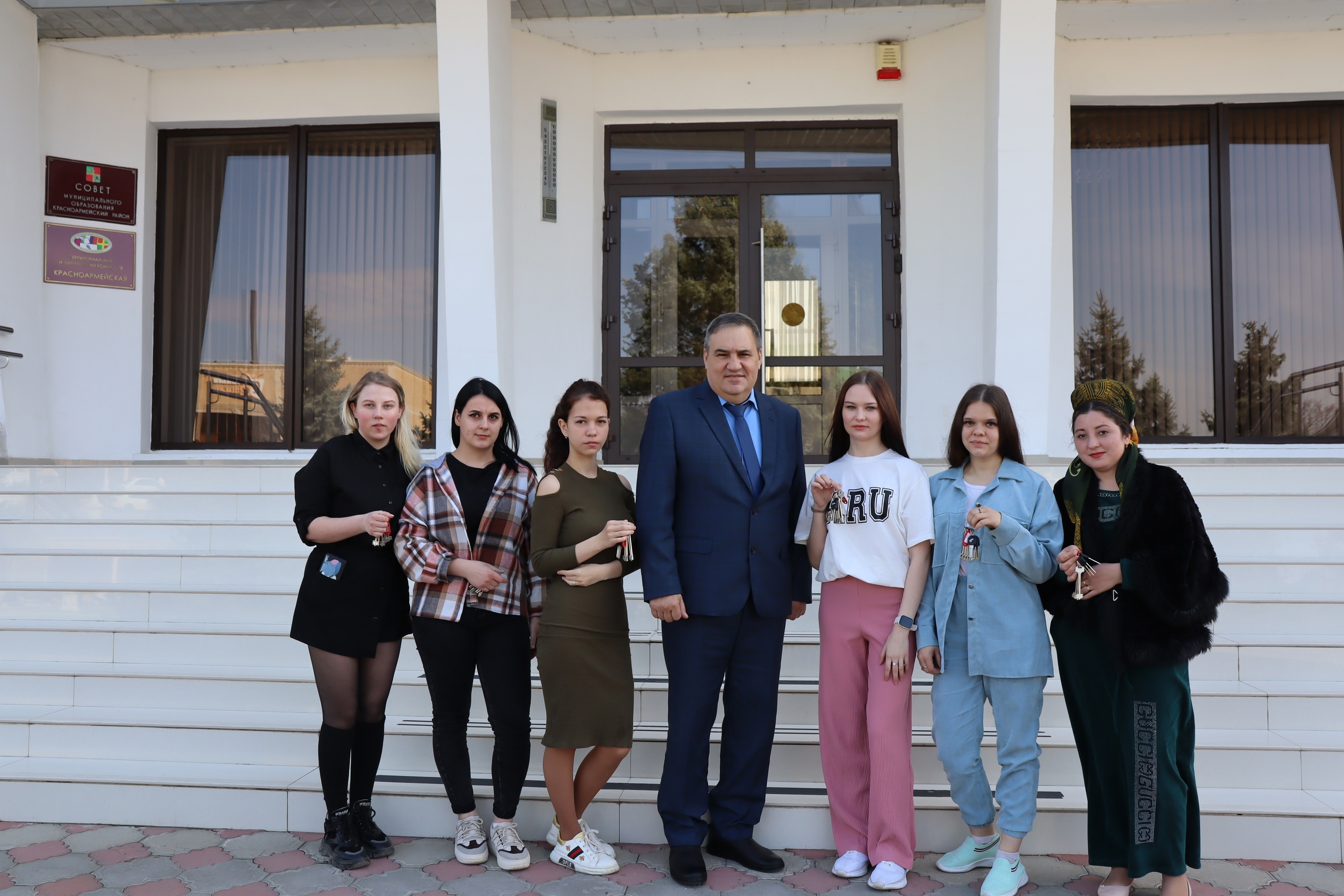 Счастливыми новосёлами стали Русалина Оглы, Виктория Плохая, Валерия Стрельникова, Анжела Пильнова, Беатрис Крист, Вероника Косенок. Все они получили квартиры в хуторе Трудобеликовском. Юрий Валентинович поздравил их с этим событием, пожелал счастья, благополучия и мирного неба над головой.