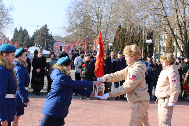 14 февраля юнармейцы муниципалитета приняли Эстафету памяти в Динском районе, а сегодня, у Вечного огня мемориального комплекса «Емка», передали ее ровесникам из Лабинского района.