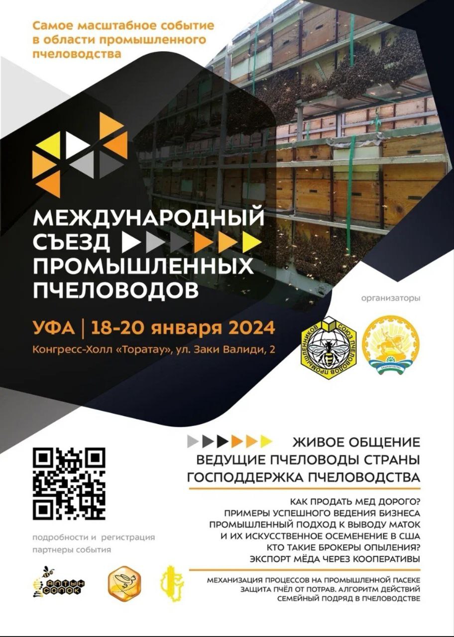 Управление сельского хозяйства администрации муниципального образования Кореновский район, доводит до вашего сведения, что в период с 18 по 20 января 2024 года в ГБУ РБ Конгресс-холл «Торатау» города Уфы проводится «Международный съезд промышленных пчеловодов».