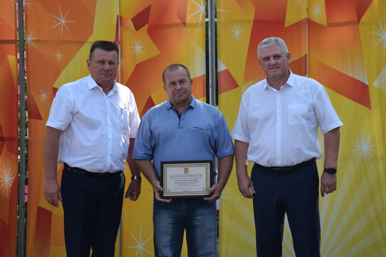 Руководителю предприятия Сергею Джуре, лучшим хлеборобам вручили караваи из зерна нового урожая.