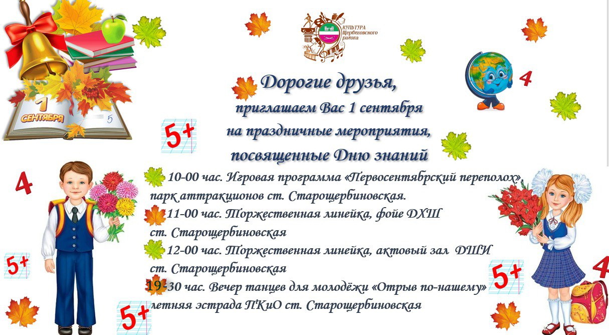 Завтра мы с вами отметим замечательный праздник — День знаний! В этом году за парты сядут 3609 школьников, из них 332 первоклассника! Чтобы сделать первый учебный день ярче, интереснее и насыщеннее для школьников подготовили различные праздничные мероприятия. В парке аттракционов с 10.00 для детей будут различные игровые программы, в 11.00 в Центре народного творчества станицы Старощербиновской состоится торжественное посвящение школьников в ряды юнармейцев, ну а вечером всех приглашаем на танцы! Также все сельские Дома культуры подготовили для ребят различные праздничные программы.