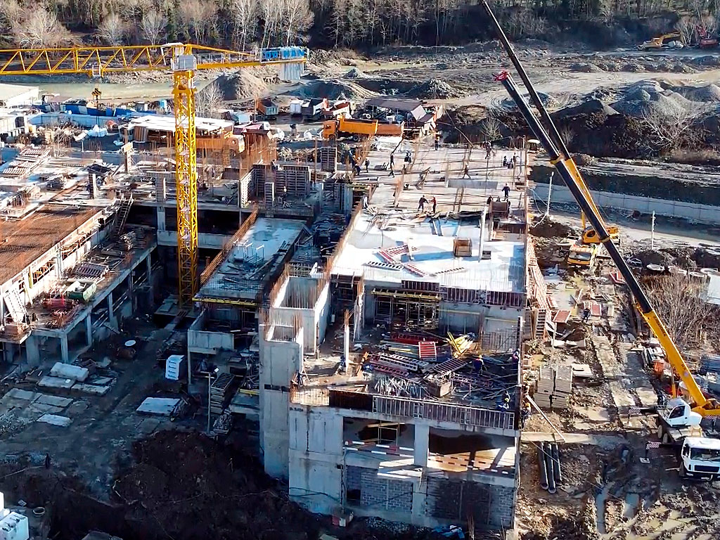 В настоящее время ведется монтаж наружных сетей канализации, водоснабжения и ливнеотведения. В здании продолжаются монолитные работы, возводятся перегородки, приступили к устройству сетей вентиляции и внутреннего водоснабжения.