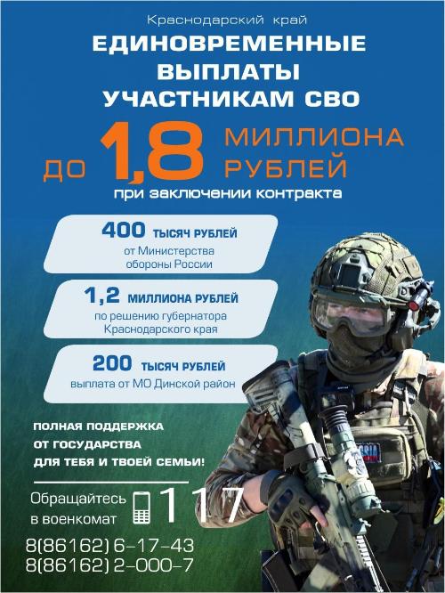 Таким образом, заключившие контракт жители Динского района Краснодарского края с 1 октября 2024 года вместе с выплатой Миноброны РФ смогут получить единовременную выплату 2 млн. 100 тыс. рублей.