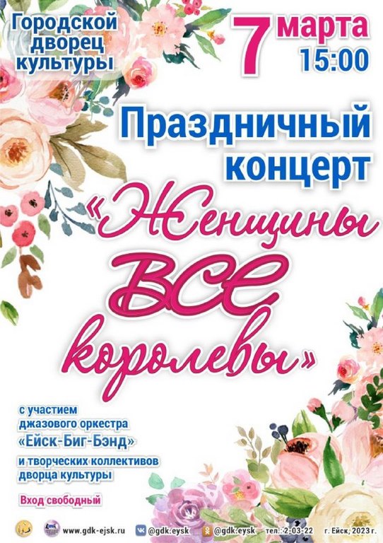 Соответствующее постановление администрации Ейского городского поселения № 176 было подписано 2 марта 2023 года «О подготовке и проведении праздничного концерта, посвященного Международному женскому дню». Согласно постановлению 7 марта 2023 года в 15 часов в городском дворце культуры им. А.А. Колесникова состоится концерт.
