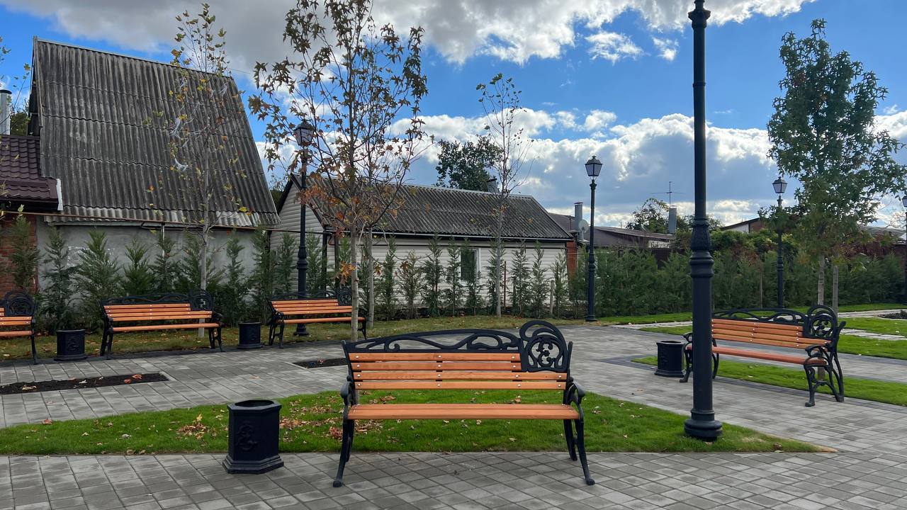 Новый сквер появился на месте пустыря. Специалисты обустроили пешеходные дорожки, установили урны, скамейки и уличное освещение. Также в зоне благоустройства провели озеленение и оборудовали систему автоматического полива.