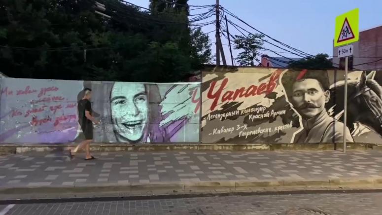 В Краснодаре на улице Чапаева снова нарисовали портрет певца Децла, закрашенного в ноябре 2022 года. Граффити расположено рядом с муралом, на котором изображен начальник дивизии Красной армии Василий Чапаев.