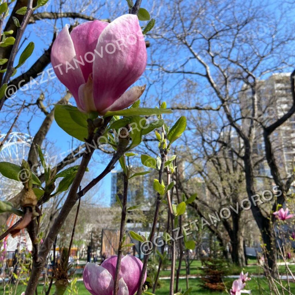 В середине апреля 2023 года в Центральном районе Новороссийска магнолия выпустила бутоны нежно-розового цвета. Местные жители и гости города-героя специально приходят, чтобы пофотографировать такое явление .