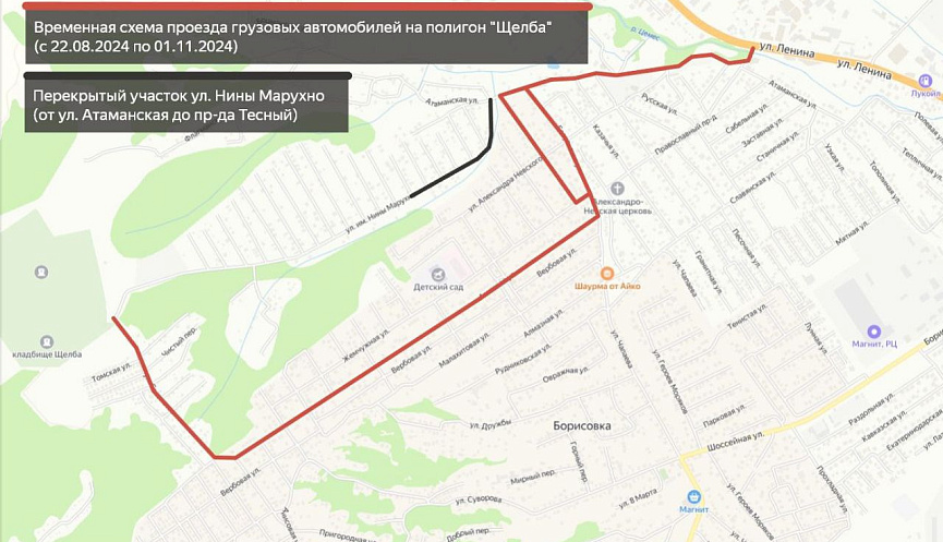 С 24 августа по 15 сентября на улице Нины в городе Марухно на участке от улицы Атаманская до проспекта Тесный движение автотранспорта будет осуществляться следующим образом: