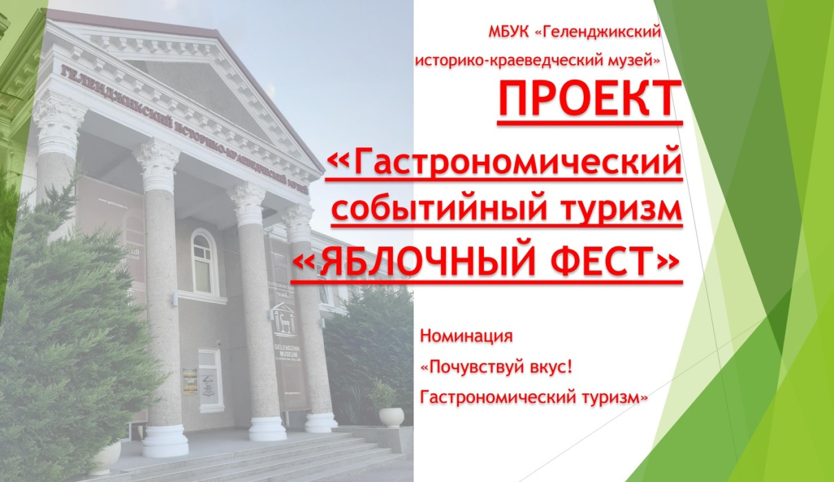 Геленджикский историко-краеведческий музей стал победителем заочного этапа Всероссийского конкурса «Туристический код моей страны, города, поселка, района – PRO-туризм». Директор музея Наталья Гадзюк представляла проект «Событийный туризм «Яблочный ФЕСТ».