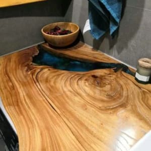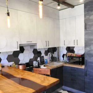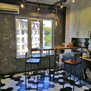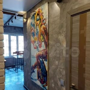 В интерьере квартиры использованы только качественные декоративные штукатурки и дорогие отделочные материалы. Барная стойка: слэб из карагача с заливкой из коричневой смолы; столешница в ванной комнате - карагач с заливкой из голубой смолы с декорацией; рабочий стол - слэб из карагача и др. Вся мебель делалась под заказ.