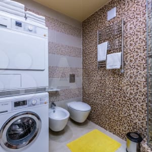Отдельно стоит отметить наличие кухни с необходимым инвентарем и оборудованием для приготовления блюд, что тоже очень удобно. В апартаментах санузел с душем и стиральной машинкой,сушилкой.