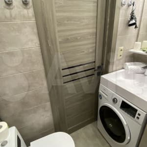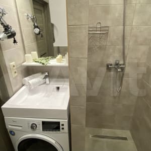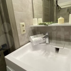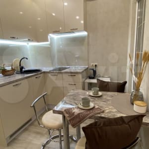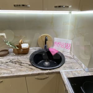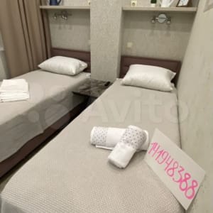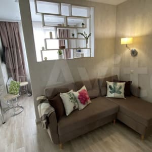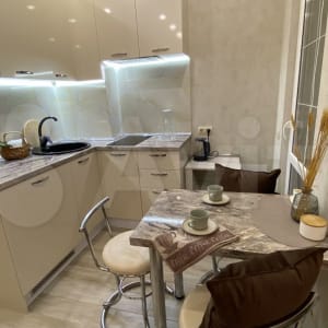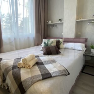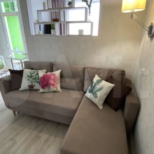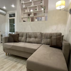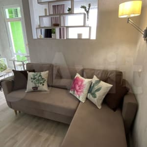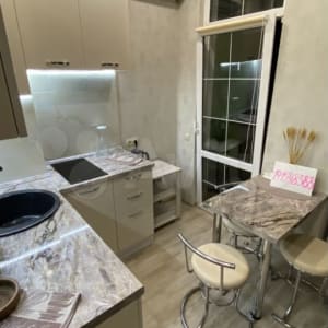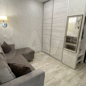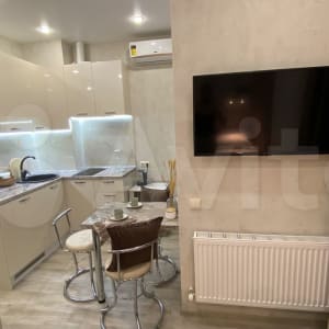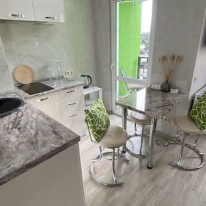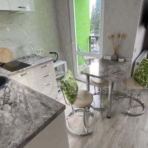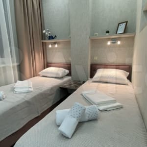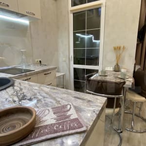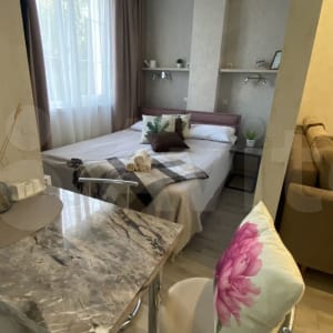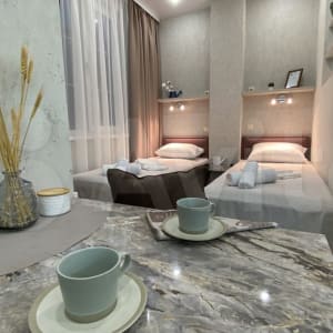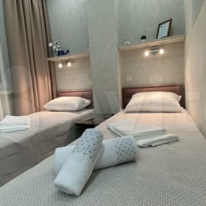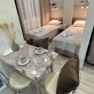 Студия разделана на несколько зон, в одной из которых уютно расположились гостиная с мягким диваном, светильником для чтения и вместительным шкафом. Спальная зона: две кровати с ортопедическими матрасами, которые соединяются в одну при необходимости, телевизор и кухонная зона с обеденным столом и все необходимой посудой для приготовлении пищи.
